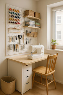 Use every wall for vertical storage. Pegboards, open shelving, and mounted thread racks keep supplies off your workspace but within arm’s reach. A narrow table with drawers underneath offers both a sewing surface and storage.